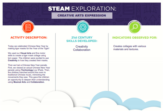 This activity also allows children to practice using their Engineering skills by working to create the masks and Math skills as they identify shapes and patterns in the torn pieces of paper. This is a fabulous example of how the Arts come alive in the Math and Engineering Zones as children express their understanding and Creativity.