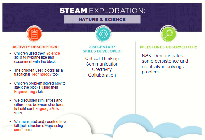 AT-HOME ACTIVITY IDEA: Our “Stacking Blocks” activity is a fabulous way for children to strengthen simple math skills while also utilizing the other elements of STEAM. Children can hypothesize about the height of their structure, describe what it looks like, and count the number of blocks in their tower.